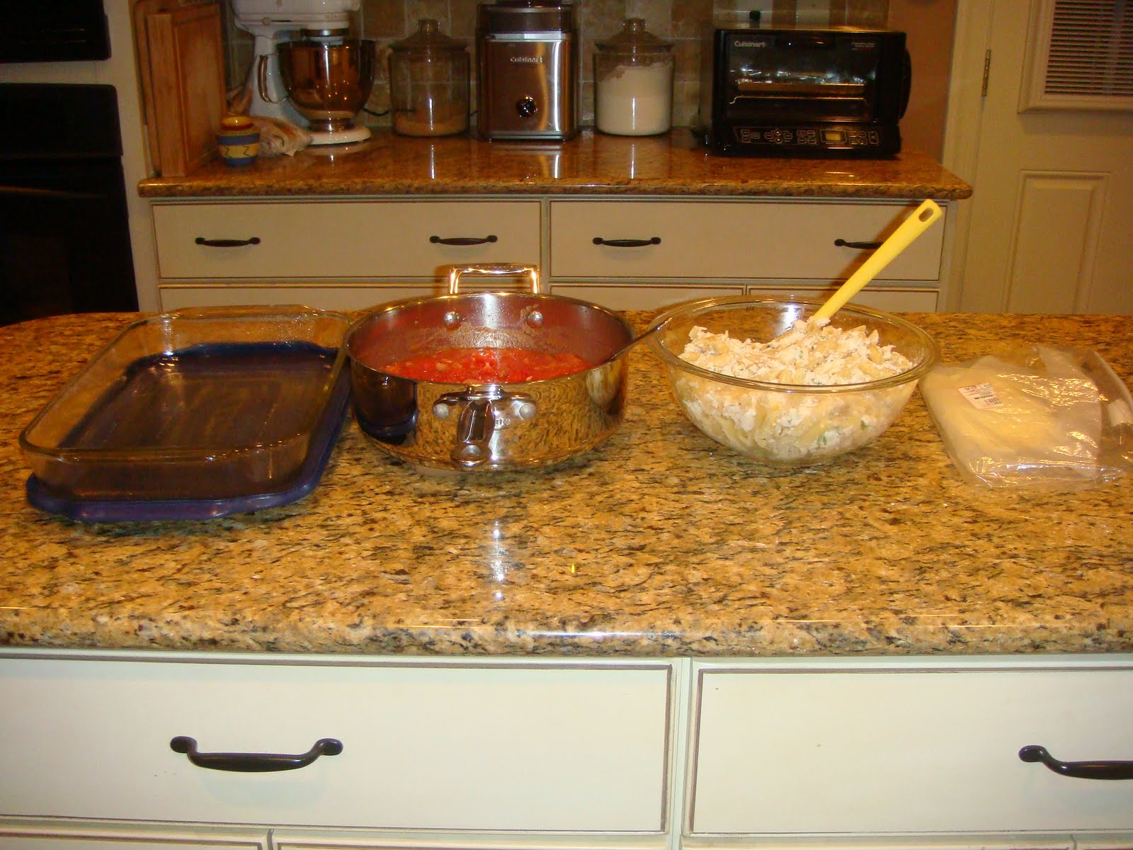 Preheat your oven to 350 degrees & start your water to cook your pasta. While the oven is heating & the water is coming to a boil, make the cheese mixture. In a large mixing bowl, combine the ricotta, mozzarella, & parmesan cheeses with the garlic & herb seasoning & the chopped parsley. Set aside.