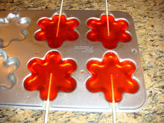 Spray your mold with nonstick spray (like Pam- a non-flavored oil). You don't have to use a mold, you could use a plain sheet pan & just pour the lollipops in rounds, or what ever funky shape you want. Just make sure you spray the pan so they don't stick, or even better, line it with parchment paper & then spray the paper! If you have molds like the smaller white plastic ones, put the sticks in the mold. You will have to add them later for the larger tin molds.