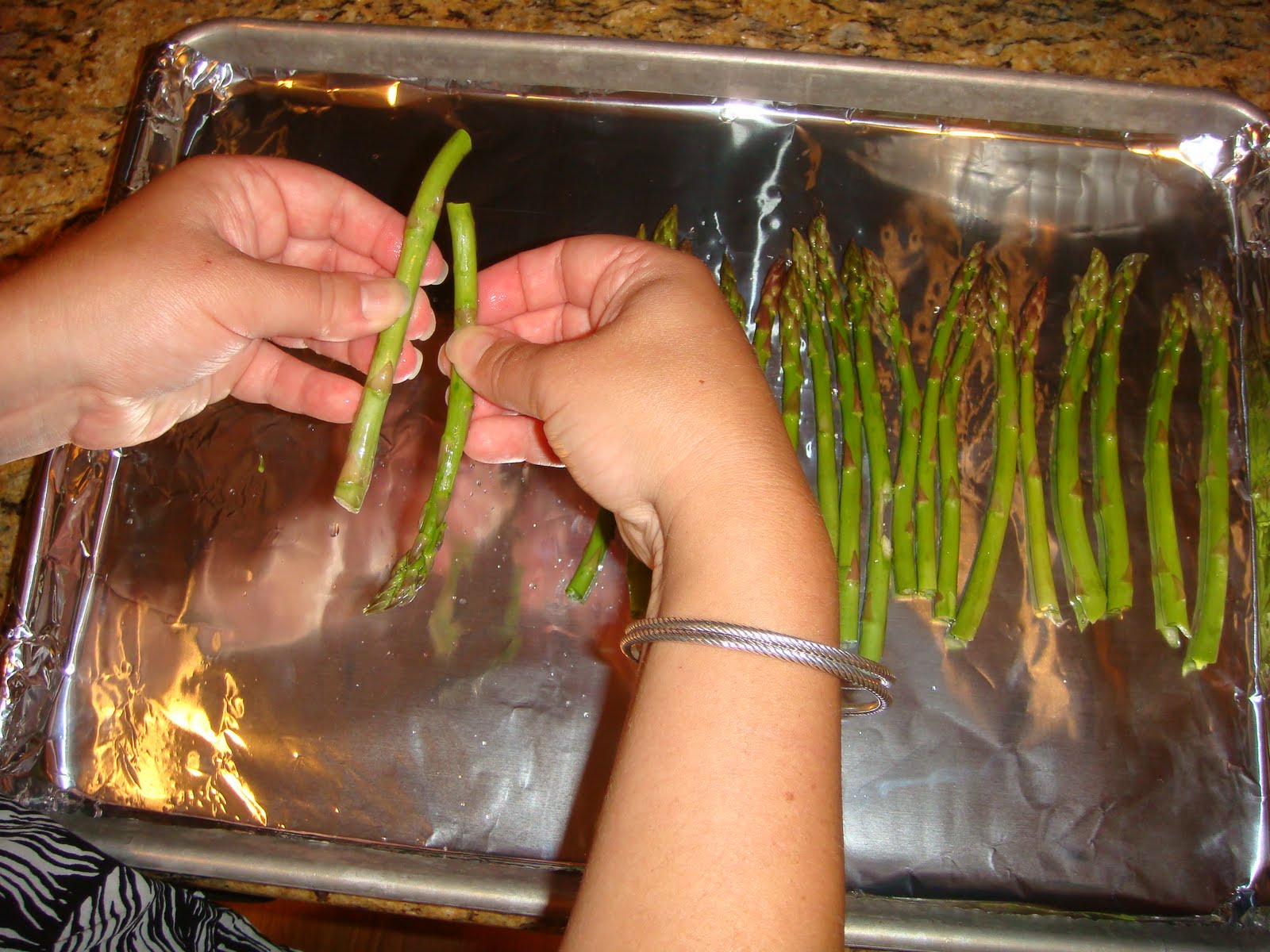 Preheat the over to 350 degrees. Wash your asparagus. Then 'snap' off the bottoms. I always bend my aparagus like this: