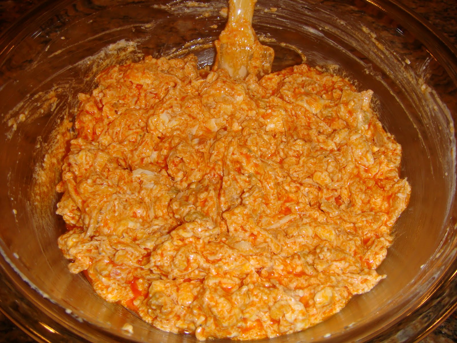 Add the shredded chicken to the pan with the celery & carrots, then add the wing sauce & stir to combine. We used Franks Hot sauce but use what ever is your favorite. Also, I never really measure the sauce, just add enough to coat the chicken & veggies well.