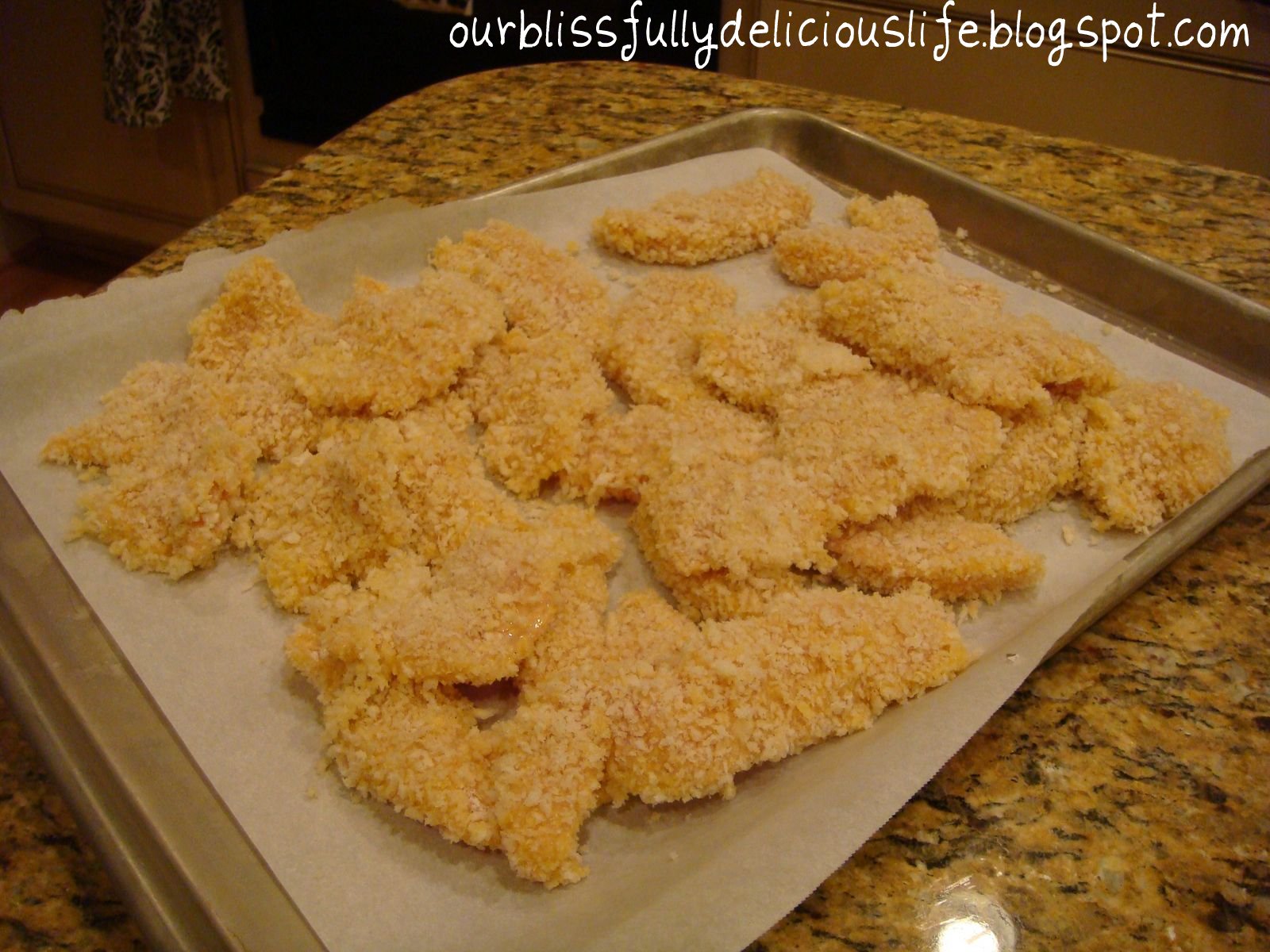 I set up another assembly line for frying in this order: raw breaded tenders on the right, oil in the center & another sheet pan lined with parchment paper on the left for the cooked chicken.