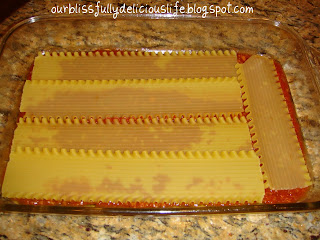 Next, place your noodles, in one layer. I love using raw noodles! It saves time & I think it's improved my lasagna too! You don't have to worry about the noodles over cooking & your lasagna falling apart.