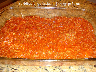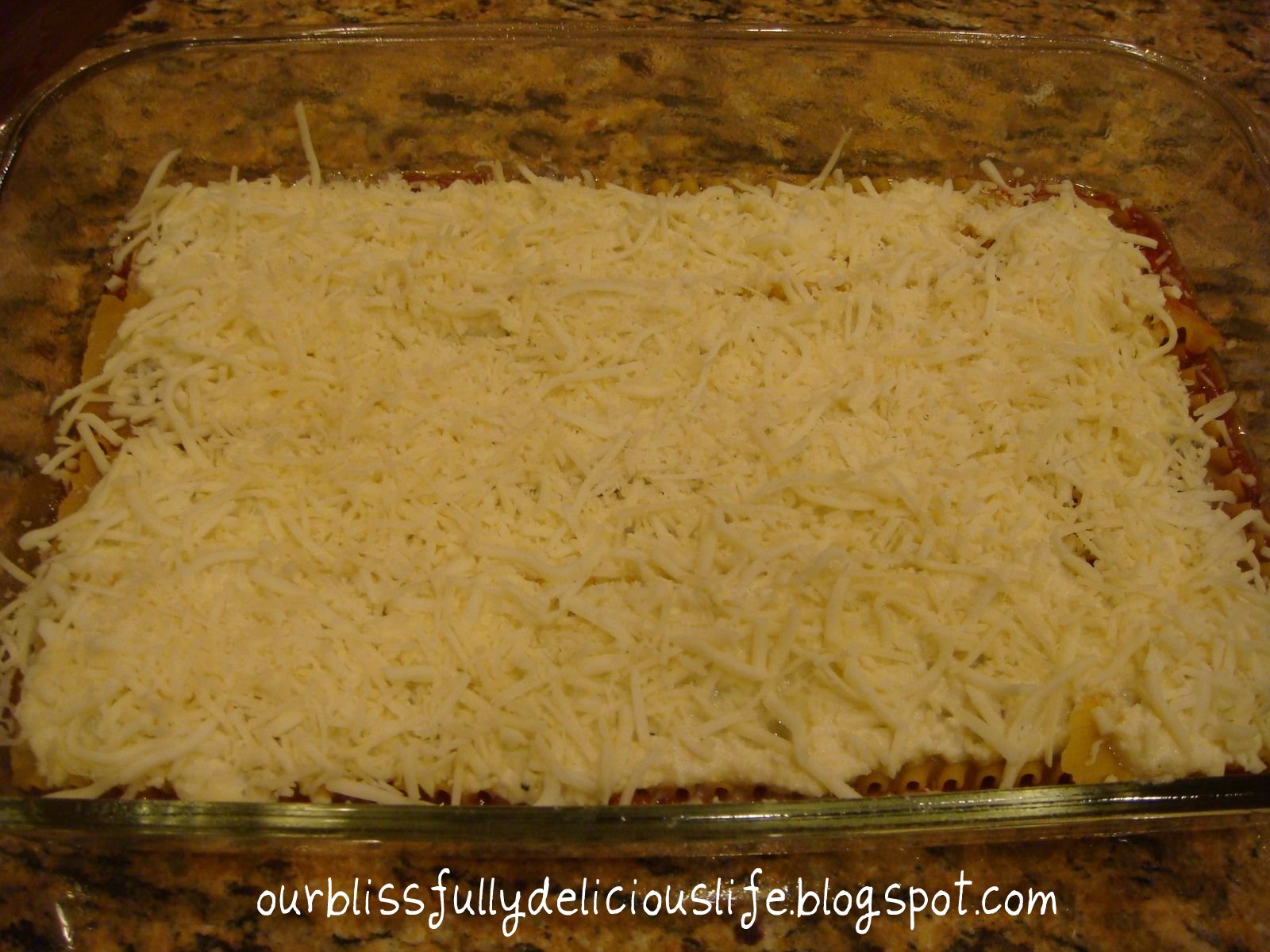 Place the final layer of noodles on top of the cheese. Pour the last of the sauce over the noodles & top with the last of the mozzarella & parmesan cheeses. Cover tightly with tin foil. I usually spray the under side of the tin foil with non stick spray so the cheese doesn't stick to it while cooking! I also put the casserole on a sheet pan, just in case it bubbles over.