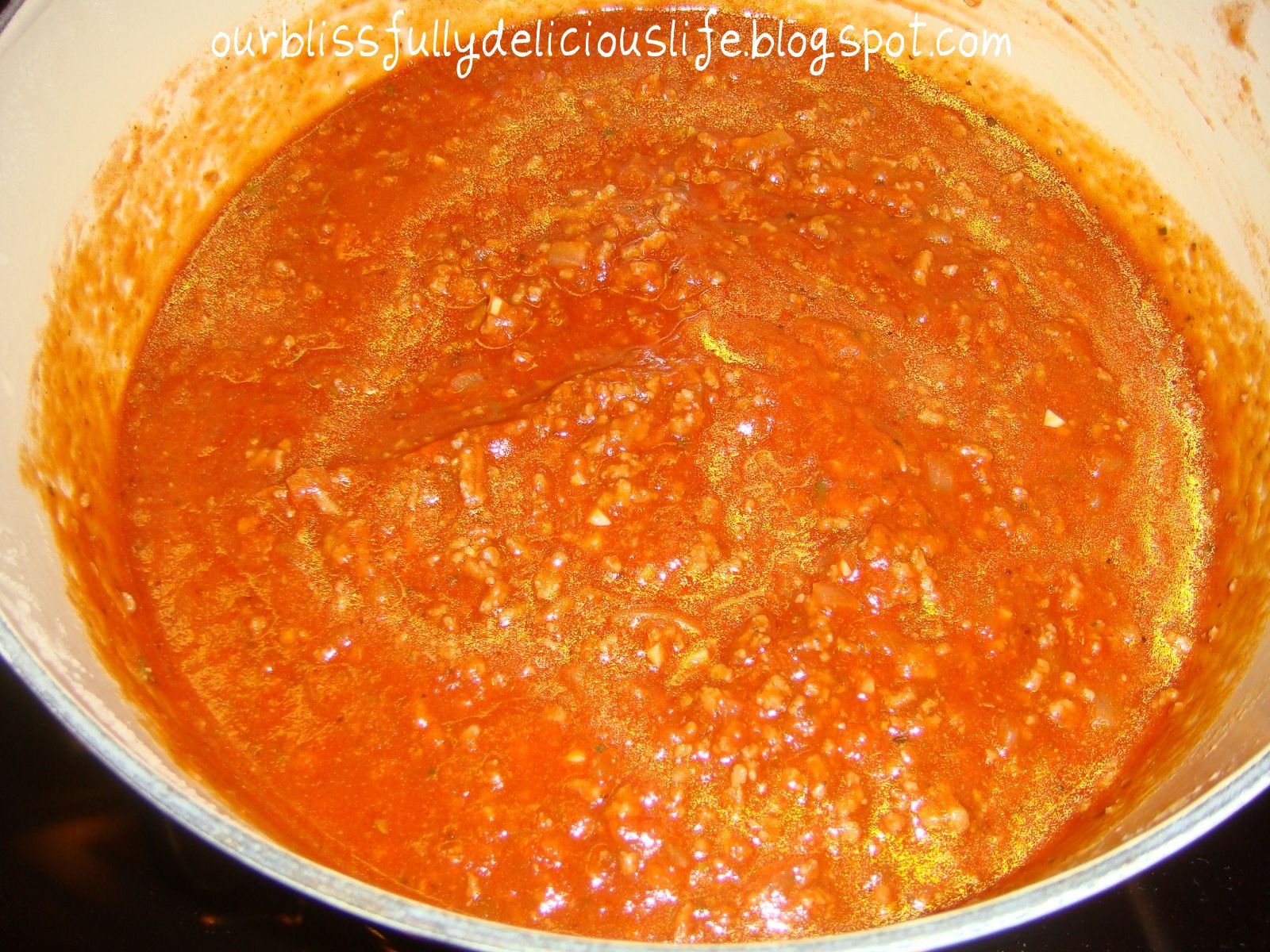 In a large chefs pan or sauce pot, drizzle a little bit of olive oil & add the ground beef. Season with salt & pepper & brown over medium- high heat. Add the chopped onion when the meat is just starting to cook. Cook until the beef is no longer pink & the onion is soft, adding the garlic for the last 1-2 minutes.