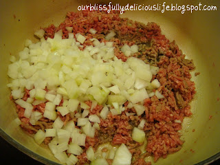 When the meat is starting to brown, add the chopped onions & saute with the meat. Season with salt & pepper.