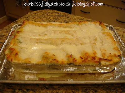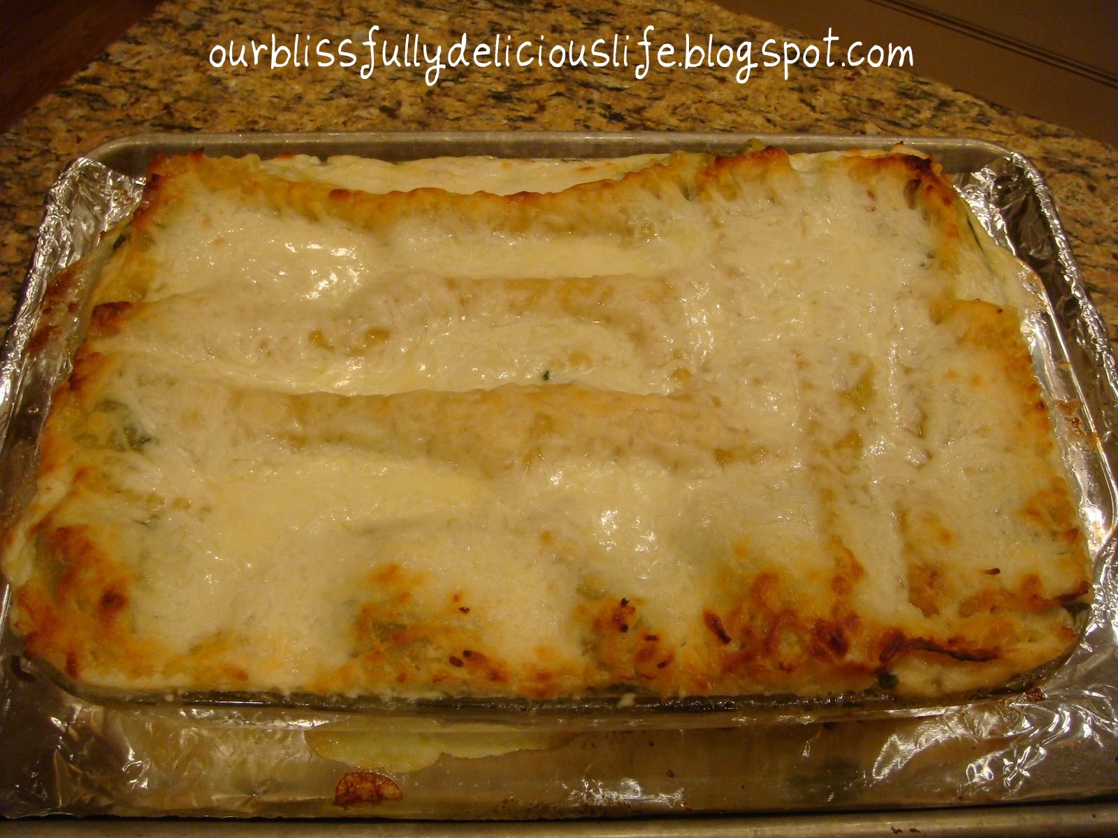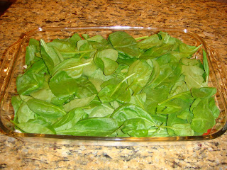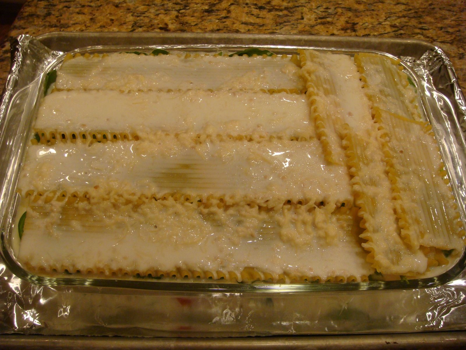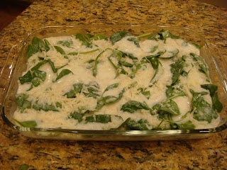 Sprinkle 1/2 cup (or so) of mozzarella cheese on top pf the spinach. (I don't really measure the cheese!)Then repeat the layers 1 more time, starting with half of the remaining garlic & parmesan cream sauce.