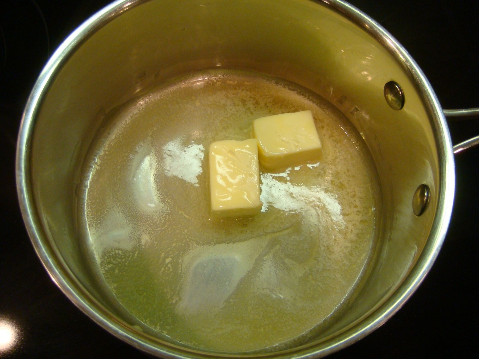 When the butter is melted, add the minced garlic & stir. Add the flour to the buttery garlic & whisk to incorporate. Cook the flour for a couple of minutes, whisking frequently.