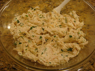 Add the ricotta, shredded chicken, garlic & herb seasoning, & fresh, chopped parsley to the beaten egg. Fold to combine.