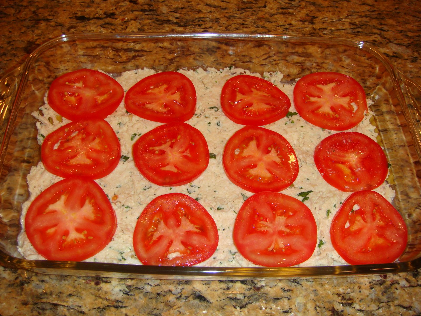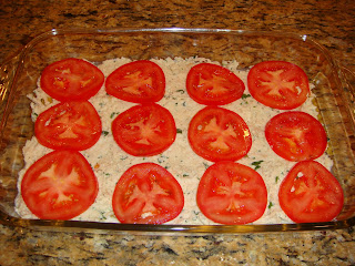Then add 1 layer of your sliced tomatoes. Season the tomatoes with a little salt & pepper.