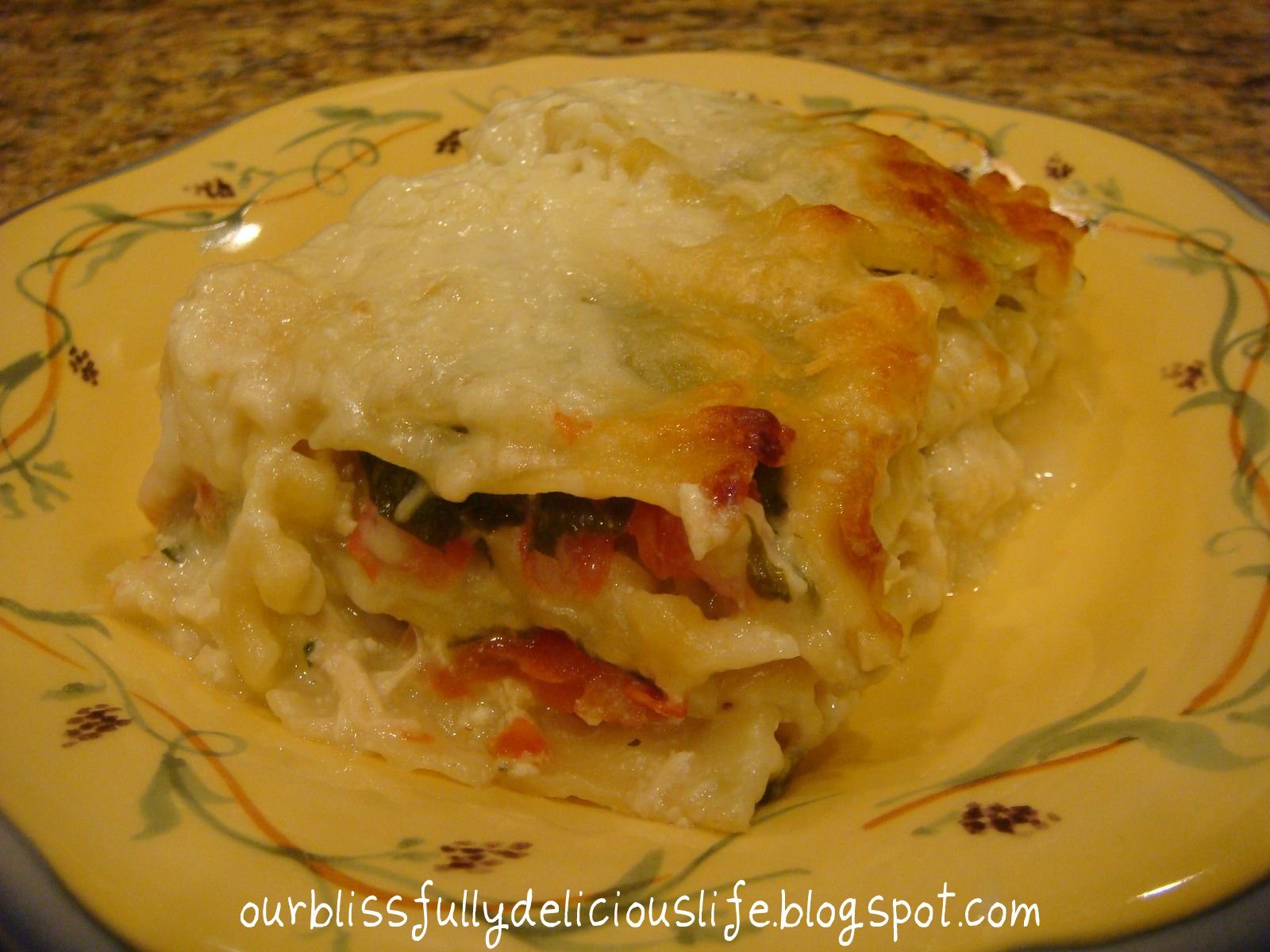 This is a delicious alternative to my Classic Lasagna. It's made with a creamy garlic & parmesan sauce, chicken, fresh spinach, tomatoes and lots of cheese. I love it!!