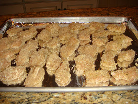 Dip the chicken, in the butter, then into the breading, then place on the sheet pan. I do a couple of nuggets at a time, until they are all coated well.
