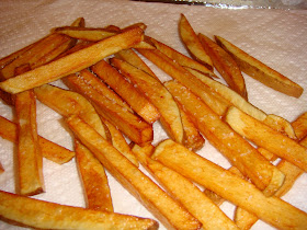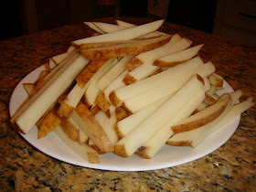 Directions:Heat your oil to 375 degrees. We have a counter top fryer that we always use to fry, so I don't really measure how much oil we use. But if you are doing this on the stove, I would suggest using large, heavy bottomed pot & about 5-6 cups of oil. We used about 5 potatoes, which was probably about 2 lbs. This evening we used russet, because that's what we had. But you could use other potatoes too. Yukon golds are a favorite. Slice them into sticks, some people like them thinner & some like them thicker. We did them a mix of about 1/4-1/2 inch. When the oil is heated to 375 degrees, carefully fry them in batches, making sure not to over crowd. We cooked these about 7-8 minutes per batch, stirring occasionally to make sure they don't stick together.
