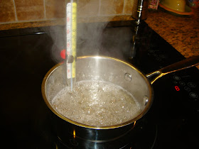 In a small sauce pan, combine the sugar, water & light corn syrup. Stir over medium heat, until the sugar dissolves. Then bump it up to medium- high & bring to a boil.