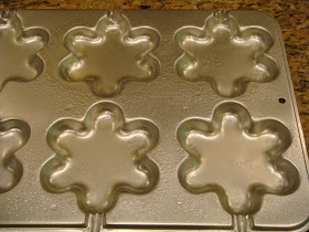 Spray your mold with nonstick spray (like Pam- a non-flavored oil). You don't have to use a mold, you could use a plain sheet pan & just pour the lollipops in rounds, or what ever funky shape you want. Just make sure you spray the pan so they don't stick, or even better, line it with parchment paper & then spray the paper! If you have molds like the smaller white plastic ones, put the sticks in the mold. You will have to add them later for the larger tin molds.