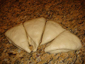Cut your dough in 8 even pieces. I made mine into a large circle & then sliced it into pie slices, like a pizza.