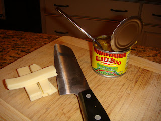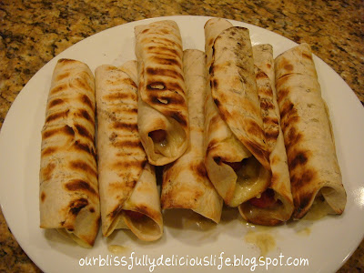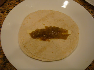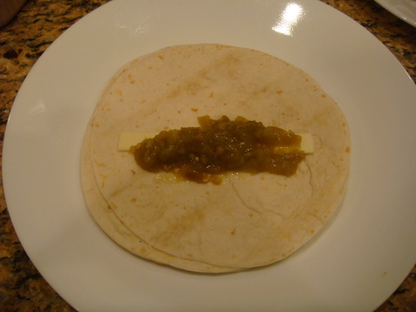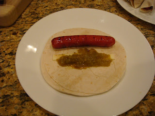 First, grill all of your hot dogs. I used regular, not bun length hot dogs. If you want to make them a little larger or if you are using a larger hot dog, like Ball Park, you might want to get the next size larger tortilla shells. While they are grilling you can get the rest of the ingredients together. I used white american cheese (think white triangular cheese at Subway). It melts really well & we had a bunch of it in the refrigerator. But you can use any kind of cheese: mozzarella, cheddar, or pepper jack would be good too if you like it a little spicy! If you are making this for grown ups, substituting a spicy pepper for the green chilies would be good too. Like jalapenos, I would just make sure that you saute them first (if you are using fresh) so they are soft & similar to the texture of the canned green chilies. When the hot dogs are grilled to your liking, bring them in & start to assemble.