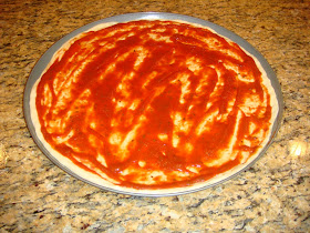 While the dough is rising, make the sauce. This seriously could not be easier. Do not buy a jar of sauce for this...this simple sauce is more authentic & perfect for pizza! Mix the can of tomato sauce with the seasonings over low heat. I cook it for a little while, leaving on low so I don't have to baby sit it. After 15 minutes, or so I shut off the heat & let it sit on the stove until I'm ready to sauce the dough.