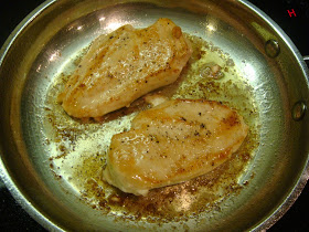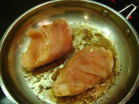In a skillet, heat about a 1/2 tbsp olive oil & a 1/2 tbsp of butter over medium/ high heat (make sure the heat is high enough to brown the chicken). Sear the chicken breast, cooking about 3-4 minutes on each side (only flipping once) until it is browned but not fully cooked.