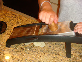Preheat your fryer to 350 degrees. Thinly slice Potatoes. I sliced them 1/8 of an inch thick. A mandolin makes this quick & easy, but a knife works just fine too. 1/8 of an inch is a little thicker than some people make them. You can certainly slice them thinner if you'd like.