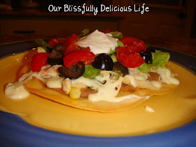 Fry your tortillas. We fried them in a counter top deep fryer at 350 degrees, for 3-3 1/2 minutes, flipping once. We poked holes in some of them as they were frying so they didn't puff up too much. You could definitely buy these already fried at the grocery store. But they are so easy to do your self & OMG they are delicious! They are perfectly crispy with just enough chewiness to not fall all apart while you are eating them. YUM! We tried both flour & corn tortillas & hands down, liked the flour ones best!! Save your corn ones for making homemade tortilla chips. :) Heat up the refried beans, I just microwaved them. Then assemble your tostadas! Here is how I made ours: Start with the tortilla, spread some refried beans on, then add the chicken & corn mixture. Drizzle melted cheese over the chicken mixture. Top with chopped lettuce, tomatoes & black olives and a big dollop of sour cream.