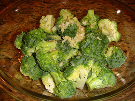 Preheat oven to 425 degrees. Wash & cut your broccoli into bite size pieces. Place them in a large bowl with the minced garlic, drizzle with olive oil. Toss well to coat evenly.
