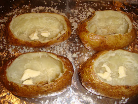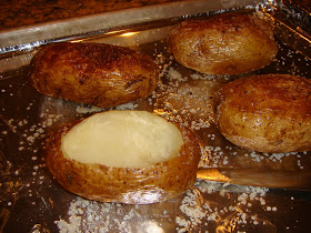 Preheat the oven to 375 degrees. Place potatoes (scrubbed clean & dried) on a sheet pan. Prick with a fork, drizzle with olive oil & season liberally with salt & pepper. Don't skip this step! It's important to season the skin too!