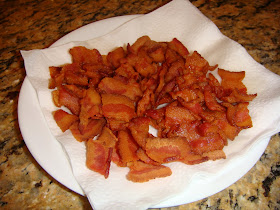 Cook the bacon in a skillet over medium/ high heat until crispy. Drain on a paper towel.
