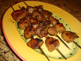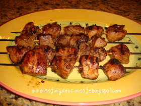 Marinate for as long as you can, I did it for 11 hours. I would do a minimum of 2 hours & up to 24. If you are using wood skewers, remember to soak them in water for an hour or so before grilling! After you have marinated the meat & soaked the skewers, make your kabobs. I pour it all into a casserole dish so the marinade can stay with the meat as long as possible. Try to get even sized pieces of chicken on each skewer so the meat cooks evenly. You can also make some veggie kabobs to go with these using onion, peppers, squash, zucchini, etc. But I wouldn't mix the meat with the veggies, especially when grilling chicken because the veggies & chicken don't cook for the same amount of time.