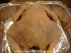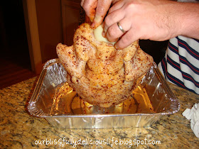 Place a whole onion in the neck of the bird.  We had to peel off a couple of the layers of the onion to get it small enough to fit in.  The onion traps the steam inside the bird, keeping the meat flavorful & moist.