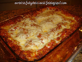 Place the final layer of noodles on top of the cheese. Pour the last of the sauce over the noodles & top with the last of the mozzarella & parmesan cheeses. Cover tightly with tin foil. I usually spray the under side of the tin foil with non stick spray so the cheese doesn't stick to it while cooking! I also put the casserole on a sheet pan, just in case it bubbles over.
