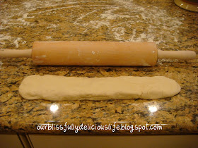 Cut the dough into 4 equal pieces. Dust your hands & a rolling pin with flour. Gently roll & stretch 1 piece of the dough into a 12" rope.