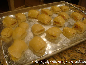 Stretch & pull the bottom of the dough over the ham & cheese, pressing to tightly hold the filling inside. Roll into a rope.
