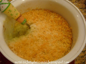 Spread the creamy jalapeno mixture to a small a small casserole dish or oven proof bowl that has been sprayed with non stick cooking spray.