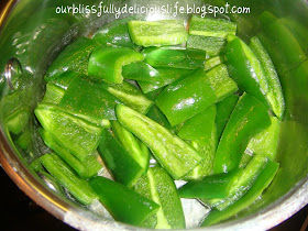Slice the top of the peppers, then quarter them. If you want a lot of heat, leave some of the seeds & the white veins that hold the seeds. If you want to make the dish not spicy, cut them all out like this.