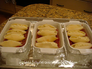 Fill the pasta shells with 1-2 tbsp of the filling & place on top of the sauce.
