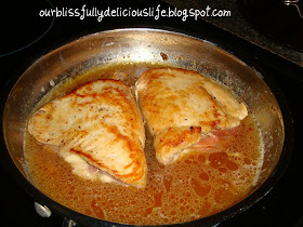 In a medium/ large skillet (10" or so) melt 1 tbsp of butter with the olive oil over medium- high heat.  (I used a smaller skillet in the picture above because I was only cooking 2 chicken breasts for us.)  You want the skillet pretty hot to sear the chicken, but you don't want too as it will burn your butter.  Sear the chicken on both sides, about 3-4 minutes on each side.