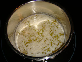 Once the soup is on low, drop the Parmesan rind in, cover & let it simmer.  Let it simmer for as long as you can.  I let mine simmer a couple of hours.  If you don't have an hour or so for it to cook, don't waste your Parmesan rind on it.  Save it for another time.  I stir it occasionally, but on you don't really have to worry about it over low heat.