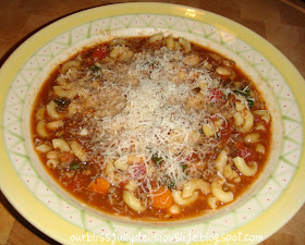 This is my (very American) version of the Italian soup, Pasta e Fagioli, meaning pasta with beans.  It is one of my favorite soups.  Patty, good friend of mine, brought my family over a big pot of it accompanied by a loaf of crusty bread a couple of years ago after I had been in the hospital.  It was so thoughtful & so tasty too!  I've been hooked on it ever since.  It's really more like a stew than a soup, it's so thick.  Which is probably one of the reasons that I like it.  I make it with ground beef but if you don't eat red meat, pork, chicken, or turkey sausage would be a great substitute.  (I'd also recommend substituting chicken broth for beef in that case too!)  You can also change the beans, I use cannelloni beans but you could use kidney or any bean/ combination that you'd like.  This is definitely one of those recipes that you can make to suit your own taste (or pantry!).  If I'm lucky, I have a Parmesan rind in the freezer to add to it.  Shhhh, that's my secret ingredient!  If you don't have one, don't fret.  I don't always either so just leave it out.  It will be delicious either way!!