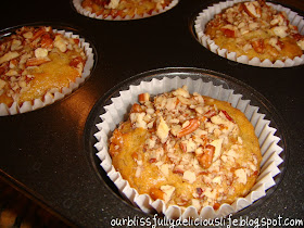 Pour mixture into prepared muffin tins, lined with cupcake liners or sprayed with non stick spray.  I made both mini & regular sized muffins.  I used paper liners on the regular & non stick spray on the minis. Sprinkle additional pecans on the top.