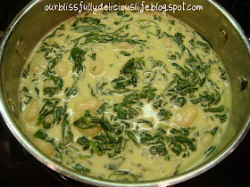When the gnocchi is done, drain it with a spider & add to the creamy spinach. (You're should look less saucy than mine, if you only use a 1/2 cup of cream.)