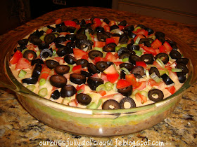 Remember that 7 Layer Dip that's been around forever? I had totally forgotten about it until the other day when I was searching for an appetizer to make.  I gave it a little bit of a make over, making my own refried beans and mashing fresh avocado instead of guacamole.  And I'm not sure that mine is quite 7 layers...I guess that's subject to interpretation.  But I can tell you that this is really, really tasty!   Everyone loved it and just look how gorgeous it was!!