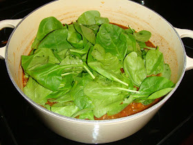 When you are ready to eat, cook your pasta, according to the package directions but slightly al dente.  Add a couple of big handfuls of fresh spinach to the soup & stir.