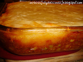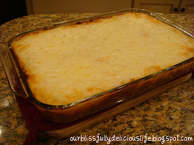 Bake at 350 degrees for 30 minutes, until bubbly & slightly browned on top.