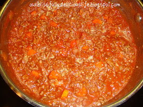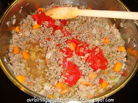 In a large skillet or chefs pan, brown the beef over medium/ high heat with a drizzle of olive oil. Add the chopped onion & carrots, salt & pepper and cook until the beef is no longer pink, adding the garlic for the last 1-2 minutes.