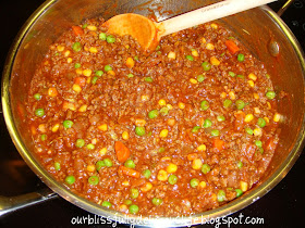 When the potatoes are done, add the peas & corn (or the veggies you want) to the meat mixture.