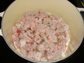 Preheat your oven to 300 degrees (if cooking in the oven).  I usually buy the beef already cut up from the grocery store.  I've bought it labeled as Stew Meat & Extra Trim Lean Stew Meat, but I really think you could use just about any inexpensive type of beef roast for this cut into 1/2"-1" pieces.
