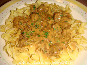 Some days I need to get dinner on the table fast.  But some days, particularly when it's cold or rainy outside, I like to take all day to slowly cook dinner.  There is something almost therapeutic about it. The house smells wonderful, feeding your senses with anticipation of what's to come.  And well, let's be honest, the taste is a great payoff.  The depth of flavor that you can achieve using only a few simple ingredients is truly remarkable.  This Beef Stroganoff is one of those heavenly meals.  I think it's my favorite of my slow cook meals.  Tender chucks of beef smothered in a creamy gravy like sauce served over egg noodles-  YUM!  I'm already looking forward to making it again.  We don't add mushrooms to because we're not fans of the fungi (hahaha).  But you certainly add them if you are!  I cook it in the oven but you can easily adapt it for a slow cooker or crock pot.  Or if you are like my friend Patty, you can be all Iron Chef like & use a pressure cooker to make this in a quarter (or less) of the time.  :)