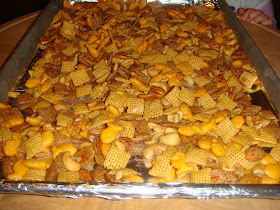 In a large bowl, combine the rest of the ingredients.  And feel free to customize here.  Like the Gold Fish, those were special for my daughter.  But you could add in pretzels, bagel chips, mixed nut, what ever you'd like!