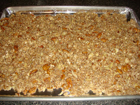 Bake at 350 degrees for 20-30 minutes, stirring half way through.  It should be a nice golden color.  Don't be alarmed that it is still soft.  It hardens as it cools.