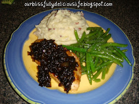 This is my version of a recipe that I found on Cooking Light. I wish it photographed better because my pictures just don't do it justice.  It is so simple & with just a few ingredients it can easily be made in 30 minutes or less. Perfect for a weeknight meal but so tasty, I'd have no problems making this for guests too. The sweetness of the caramelized onion with the tangy balsamic vinegar are match made in heaven on top of chicken. It's one of my favorite combinations! It also goes great with some creamy mashed potatoes! I wrote this recipe for 2 servings (or 2 1/2 if your my family) but it can easily be adapted to feed 1 or as many people as you'd like!